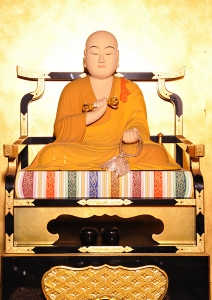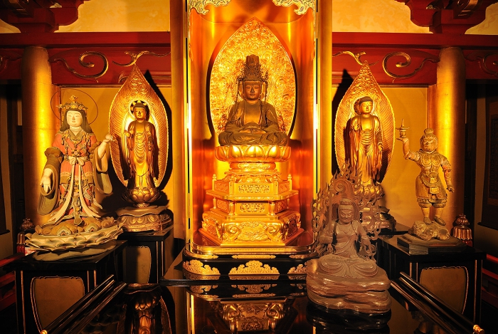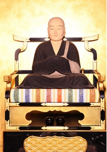 弘法大師空海は、平安時代の初め、唐に渡り、恵果阿闍梨(けいかあじゃり)より密教伝授され、帰朝後、真言宗を開きました。真言密教の教えを広めることによって人々を救済したばかりでなく、綜芸種智院(しゅげいしゅちいん)の創立や東寺講堂の建立、満濃池(まんのういけ)の修復など多方面でその才能を発揮しました。弘法大師のお像は、本尊に向かって右手にお祀りします。左手に数珠を、右手には五鈷(ごこ)を持っていらっしゃいます。