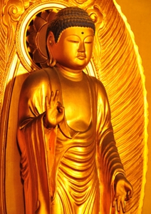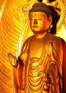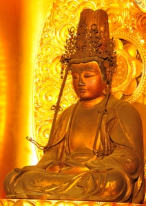 西方の極楽浄土を治めたのが、阿弥陀如来さまです。無量寿如来ともいわれます。すべての者を極楽浄土に導き、救済してくれる仏さまとして信仰されました。観世音菩薩、勢至菩薩(せいしぼさつ)を加え、阿弥陀三尊といいます。成就院の阿弥陀如来さまは、手に来迎印を結んでいらっしゃいます。この印は、極楽浄土から人々をお迎えにいらっしゃるときに結んでいる印といわれています。