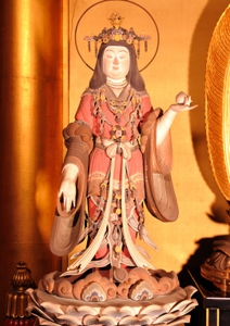 「吉祥」とは繁栄、幸運を意味し、衆生に無量の福徳をもたらす天女姿の神として祀られてきました。成就院の吉祥天は、冠に瓔珞(ようらく)といわれる飾りをつけ、天衣をまとっています。左手には如意宝珠(にょいほうしゅ)を持ち、右手は施無畏(せむい)の印を結んでいます。如意宝珠とは、ひとたび手にすれば、あらゆる願い事が叶えるという珠です。施無畏の印とは、仏・菩薩が衆生の恐れの心を取り去って救うことを象徴した印であるといわれています。