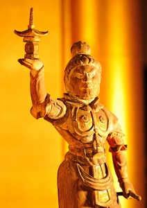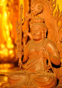 常に道場を守護する存在で、仏の説法を聞く機会が多いことから多聞天といいます。夜叉(やしゃ)、羅刹(らせつ)の首領であり、帝釈天(たいしゃくてん)のもとで北方を守護する神です。軍神として崇敬されましたが、後に福徳神として七福神に数えられました。四天王の一つにも数えられ、毘沙門天(びしゃもんてん)とも呼ばれました。成就院の多聞天は、甲冑(かっちゅう)に身を固め、右手には宝塔を、左手には剣を持っています。後に、吉祥天と夫婦であるという信仰も生まれてきました。